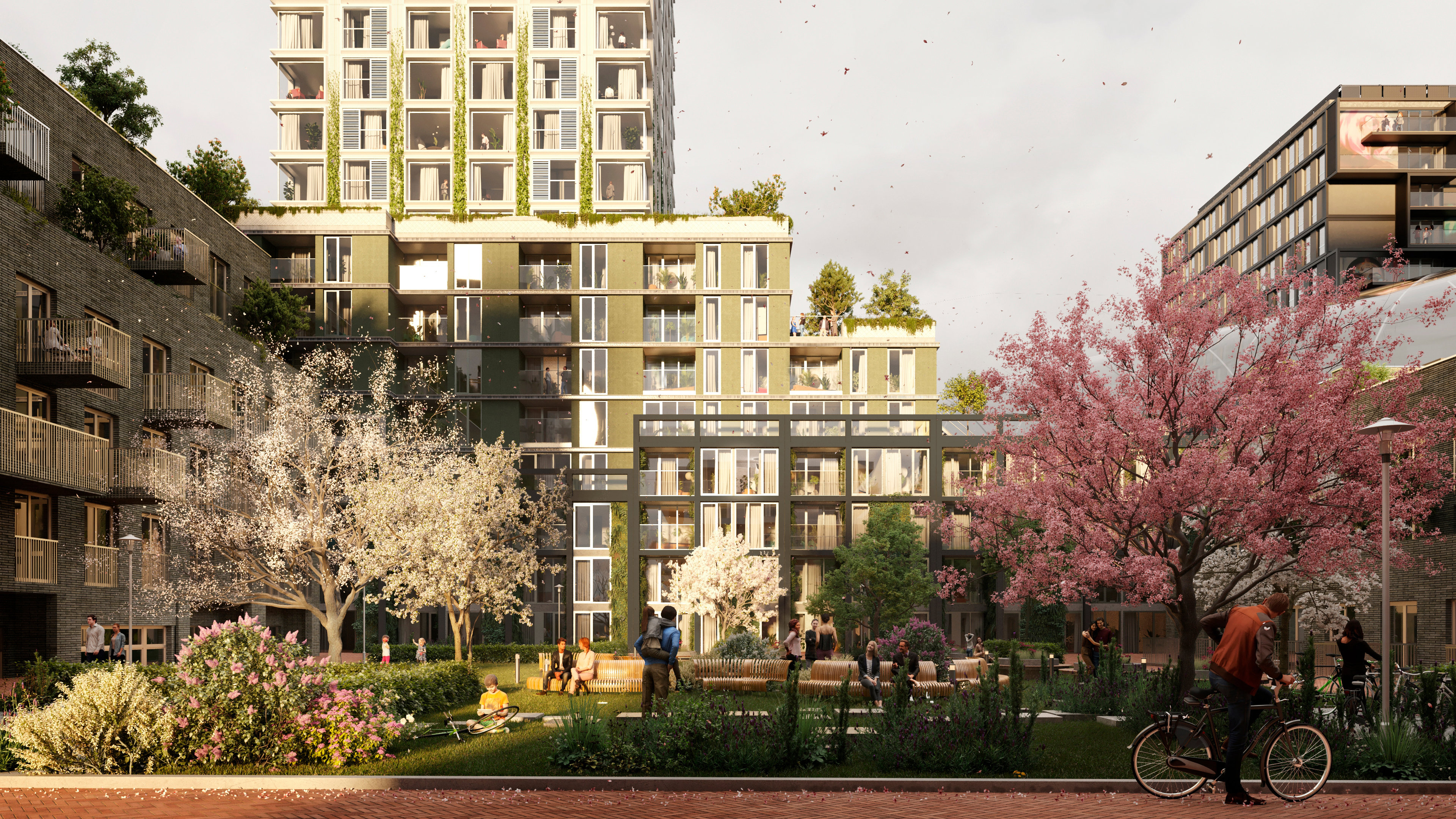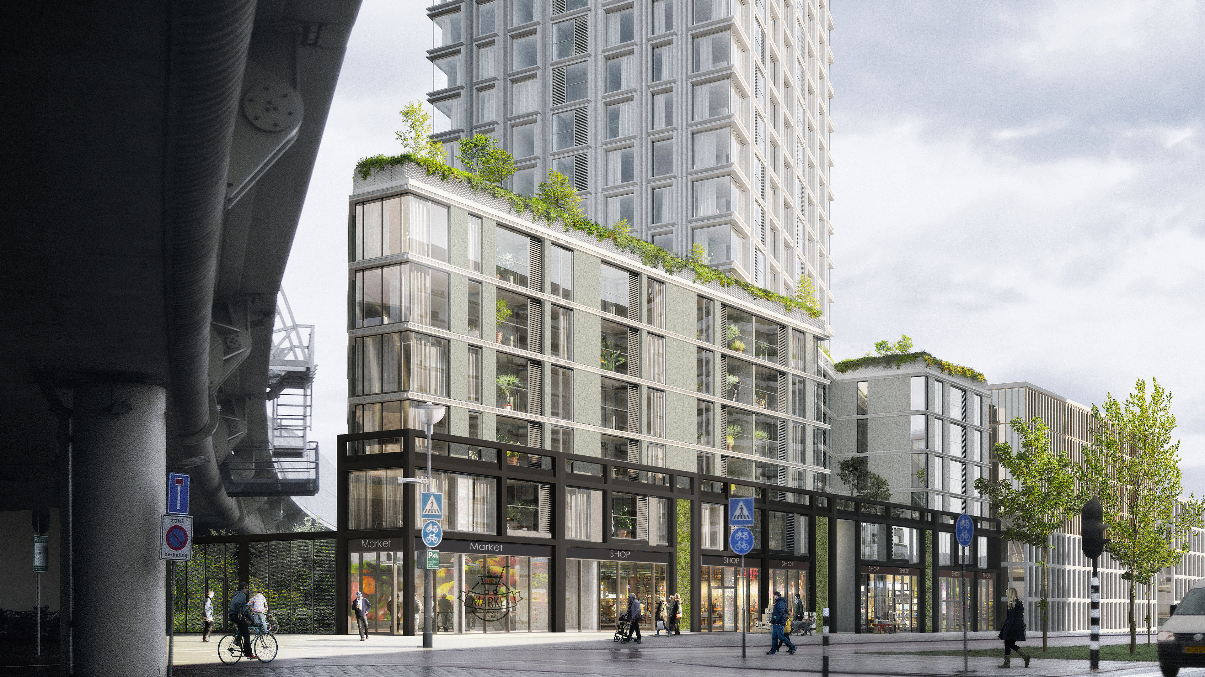 Naast woningen bieden de torens ruimte aan publieke voorzieningen voor de bewoners en de buurt. Speerpunten zijn ruimtelijke kwaliteit en waarborging van sociale veiligheid. De westelijke glazen toren van 90 meter hoog is rank en rechthoekig. De opengewerkte hoeken zorgen voor een maximaal uitzicht. De oostelijke toren is 40 meter hoog en is bedoeld voor studentenhuisvesting. De lagere, oostelijke toren verkrijgt dynamiek door de opbouw uit verschoven blokken. Bij de entree, die zich aan de stationszijde bevindt, zijn alle faciliteiten gesitueerd. Op en rond het tweede maaiveld groeit beplanting. Het groen draagt bij aan klimaatbeheersing, opvang van overtollig water, geluiddemping en verbetering van de luchtkwaliteit. Ook moet het rijkelijke groen zorgen voor biodiversiteit. Regenwater stroomt langs de gevels en terrassen naar een bassin in de vorm van een vijver. The Secret Garden op het dak van de parkeergarage en onder het spoor vormt de verbinding tussen beide woongebieden.